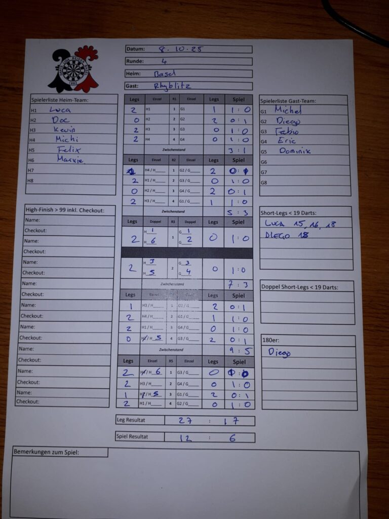 Heute folgte der nächste Streich: Gegen die erste Mannschaft des DC Rhyblitz ging DCB 1 früh in Führung und setzte sich am Ende mit 12:6 durch. Luca gelangen dabei drei Short Legs (<19 Darts). Damit schafft unser Team den Sprung in die obere Tabellenhälfte.